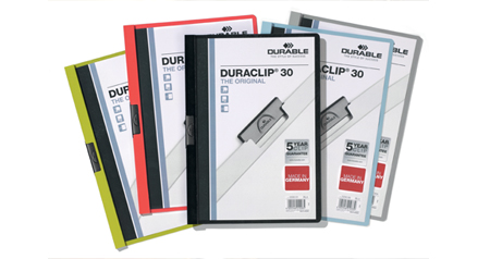 The original Duraclip patented in 1959 leads the global clip folder market and is the most successful business folder worldwide. Its guaranteed special steel clip grips documents securely without damaging them by punching. The product is available in numerous colours and wide variations for different applications.