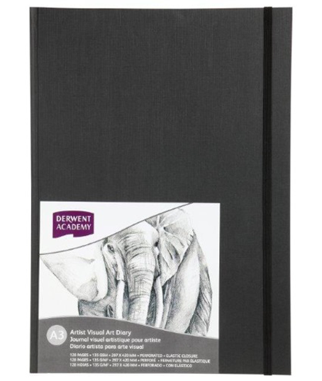 Ideal for colouring, sketching and drawing. Made from high quality Derwent 135gsm acid free cartridge paper, this Visual Art Diary has 128 pages, casebound spine and a stylish hardcover, black linen finish. Additional features include a thick elastic closure and perforated pages so you can tear out your artwork.